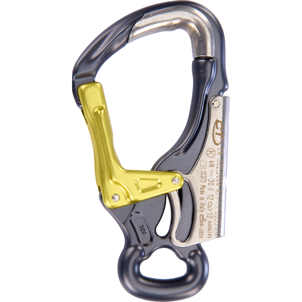 Moschettone a doppia leva in lega leggera forgiato a caldo, ideale come terminale di longes per via ferrata o per parco avventura.